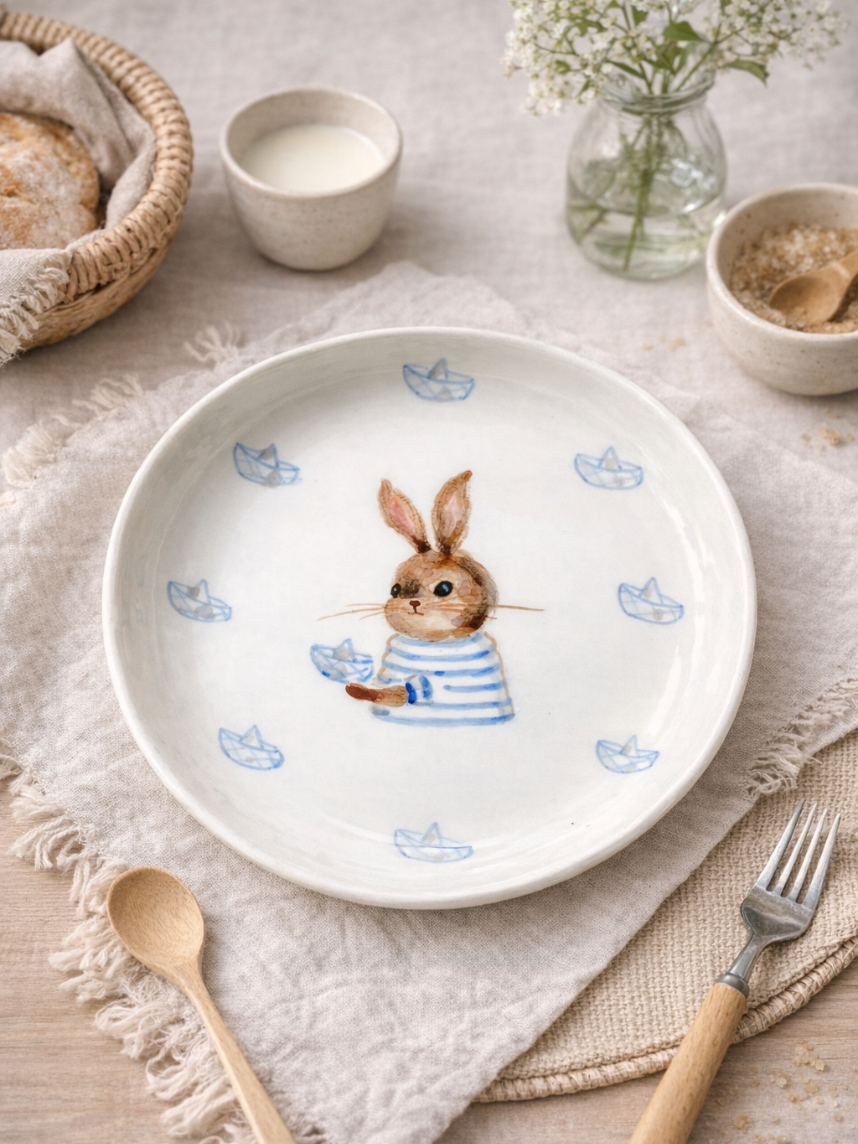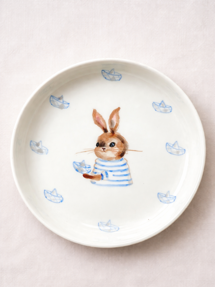 Тарелка ручной работы с бортиком «Зайка с бумажными корабликами». Производитель - керамистка Ситникова Юлия (Kim.ceramics).