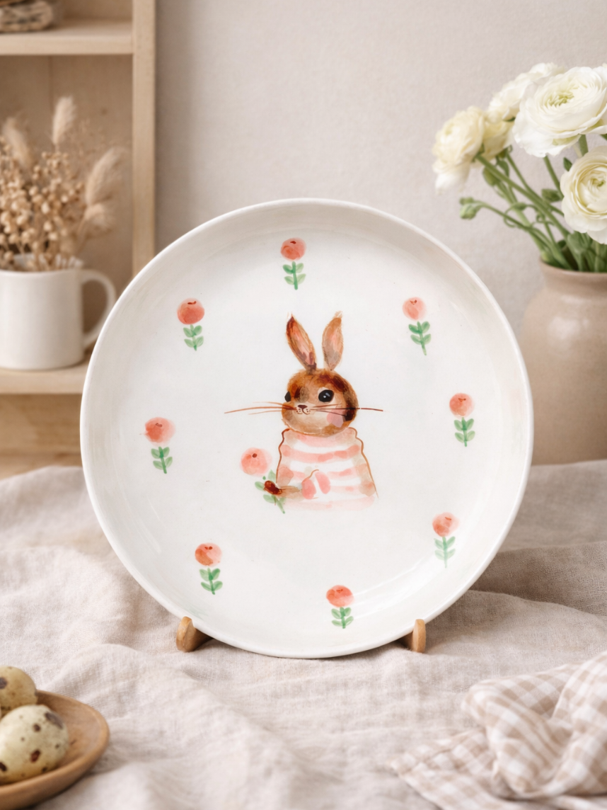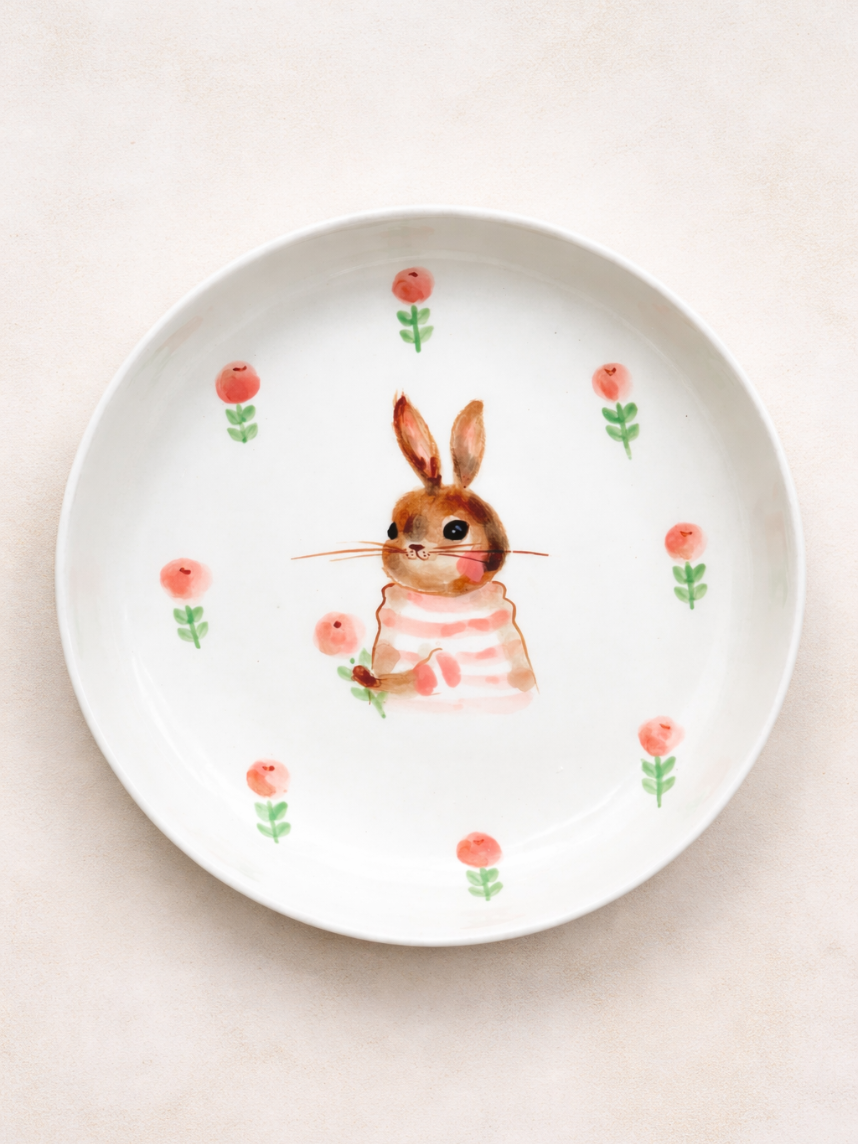 Тарелка ручной работы с бортиком «Зайка с розовыми ягодками». Производитель - керамистка Ситникова Юлия (Kim.ceramics).