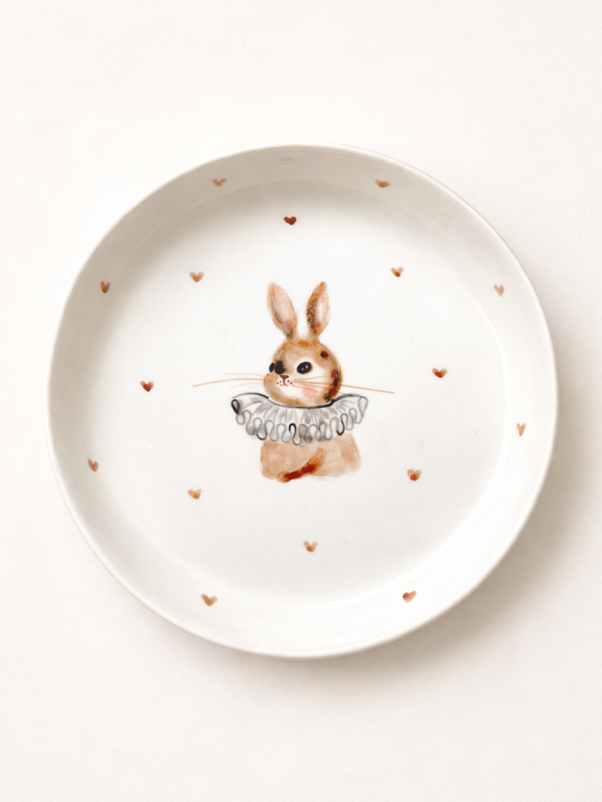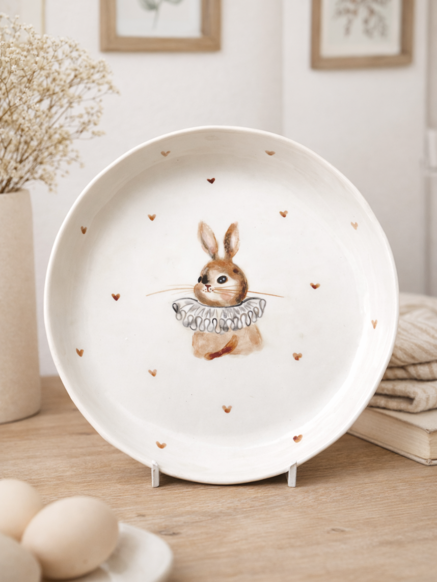 Тарелка ручной работы с бортиком «Зайка в жабо с коричневыми сердечками». Производитель - керамистка Ситникова Юлия (Kim.ceramics).