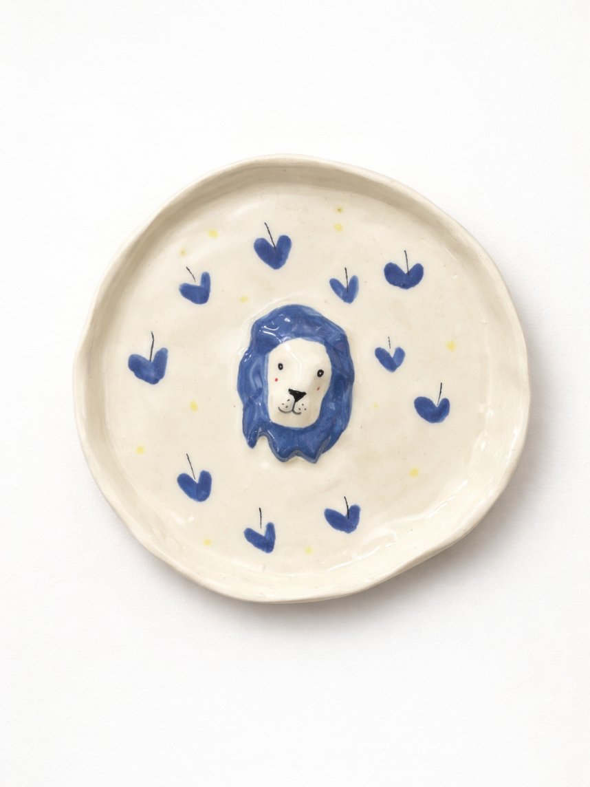 Тарелка ручной работы с фигуркой Лев с синими сердечками, полуфарфор, 13 см