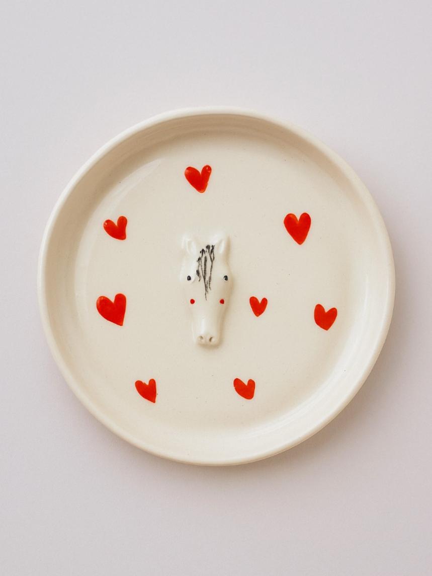 Тарелка ручной работы с фигуркой Лошадка, белая с сердечком, полуфарфор, 13,5 см