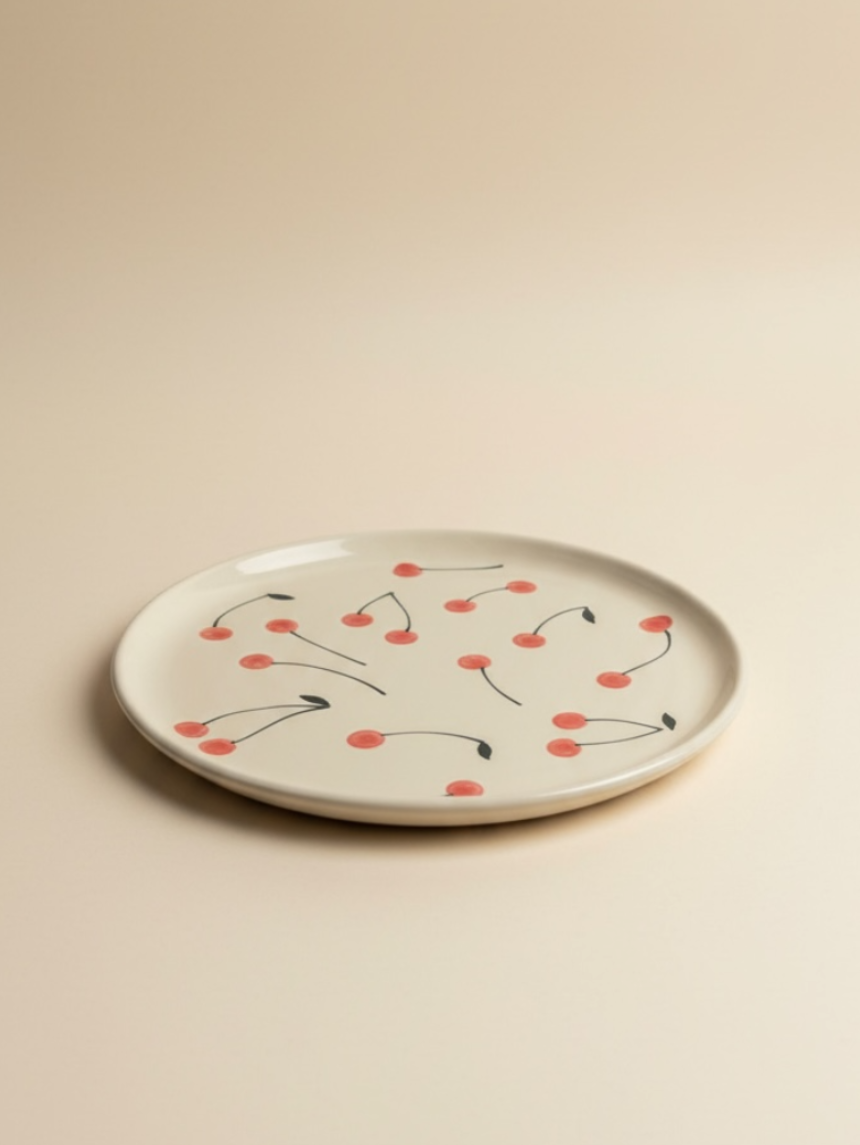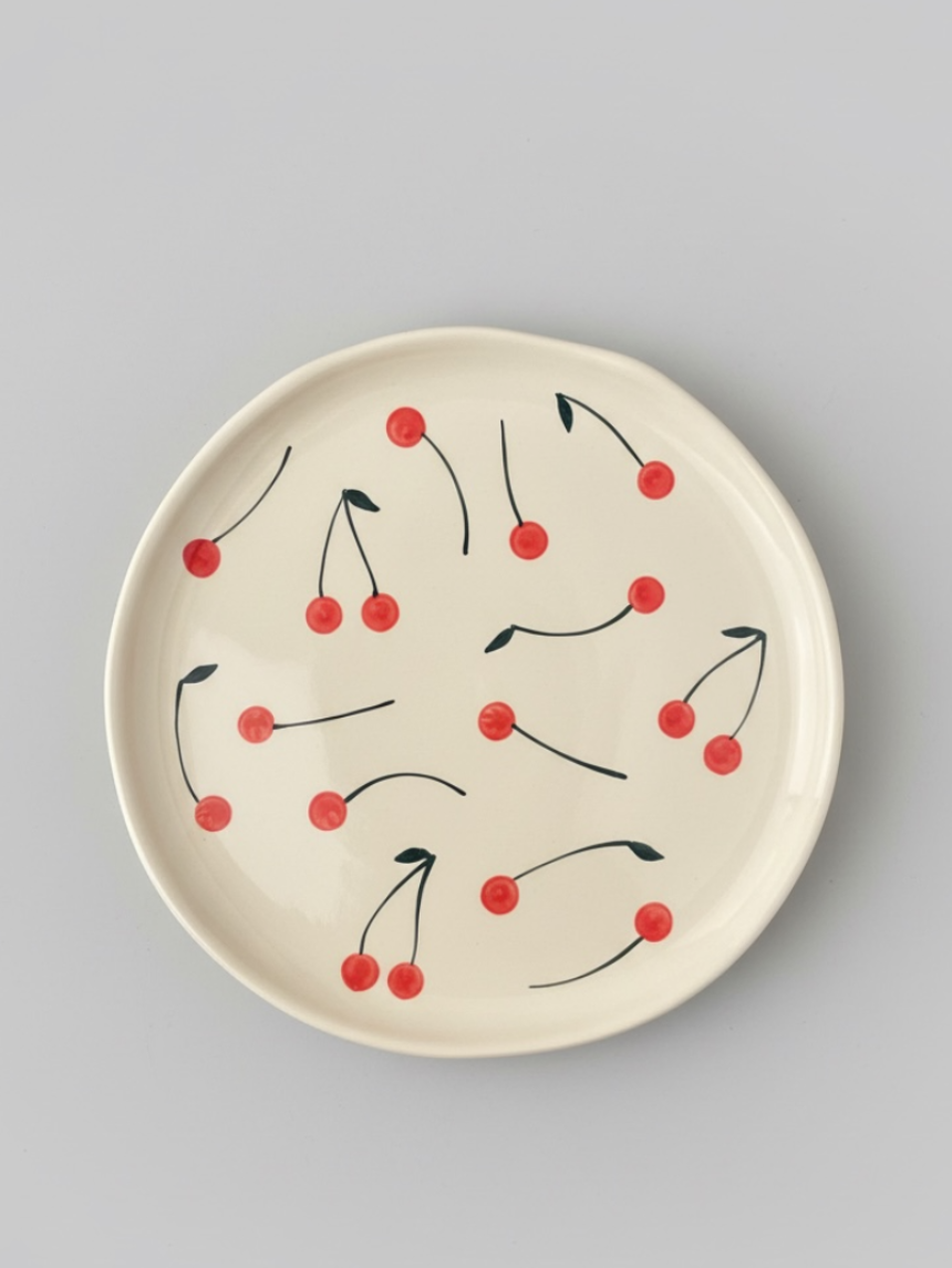 Керамическая тарелка ручной работы с росписью Вишня. Производитель - петербургская керамистка Трафимова Мария (Trafimova ceramics).