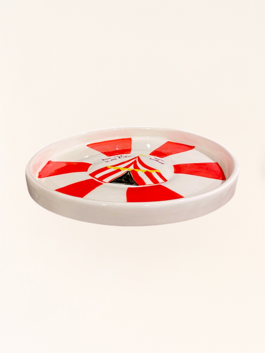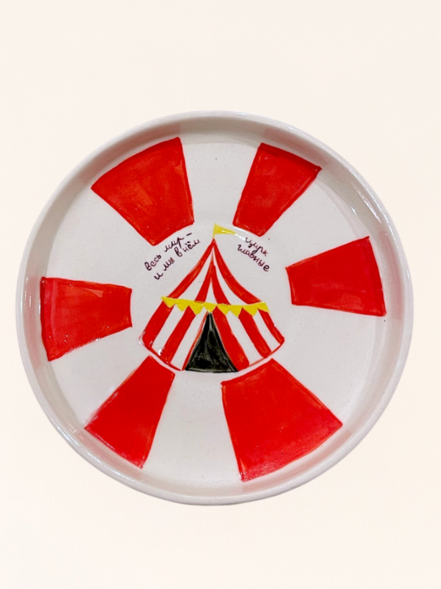 Тарелка - шляпа из керамики ручной работы, с принтом циркового шатра и надписью "Весь мир - цирк, а мы в нем главные" от бренда TreeHouse.