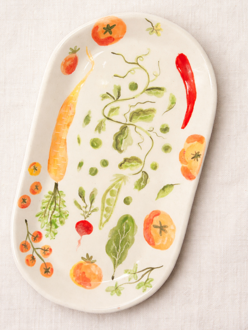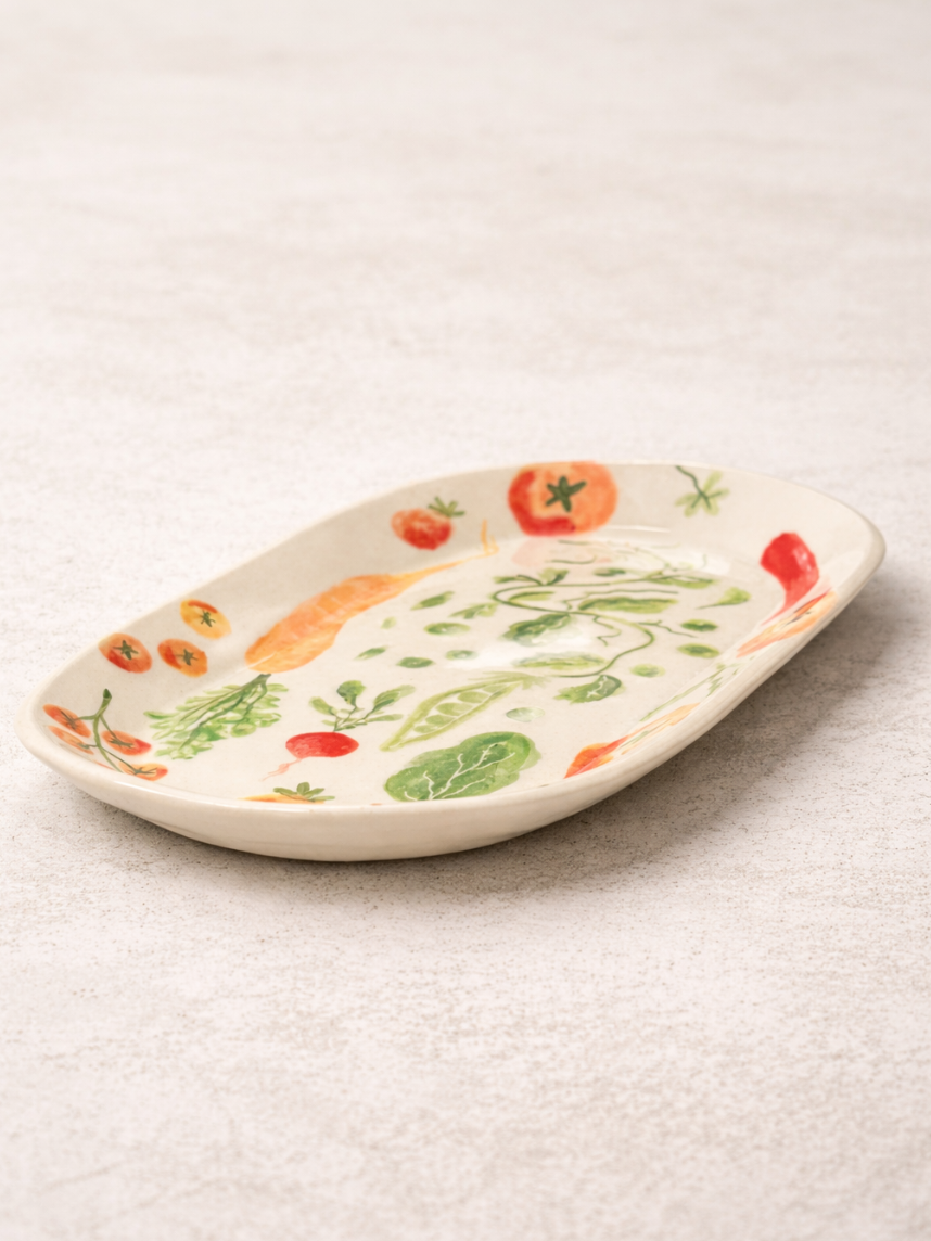 Ручная керамическая тарелка Yellowscoop диаметром 23 см с ярким узором из овощей.