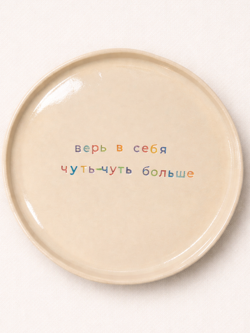Каждая тарелка выполнена вручную из высококачественной глины, отличается уникальным дизайном и позитивной надписью, вдохновляющей на уверенность и мотивацию.