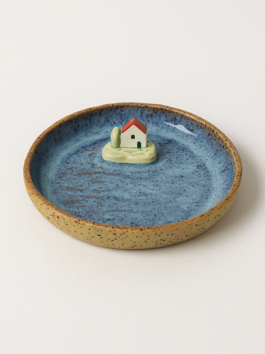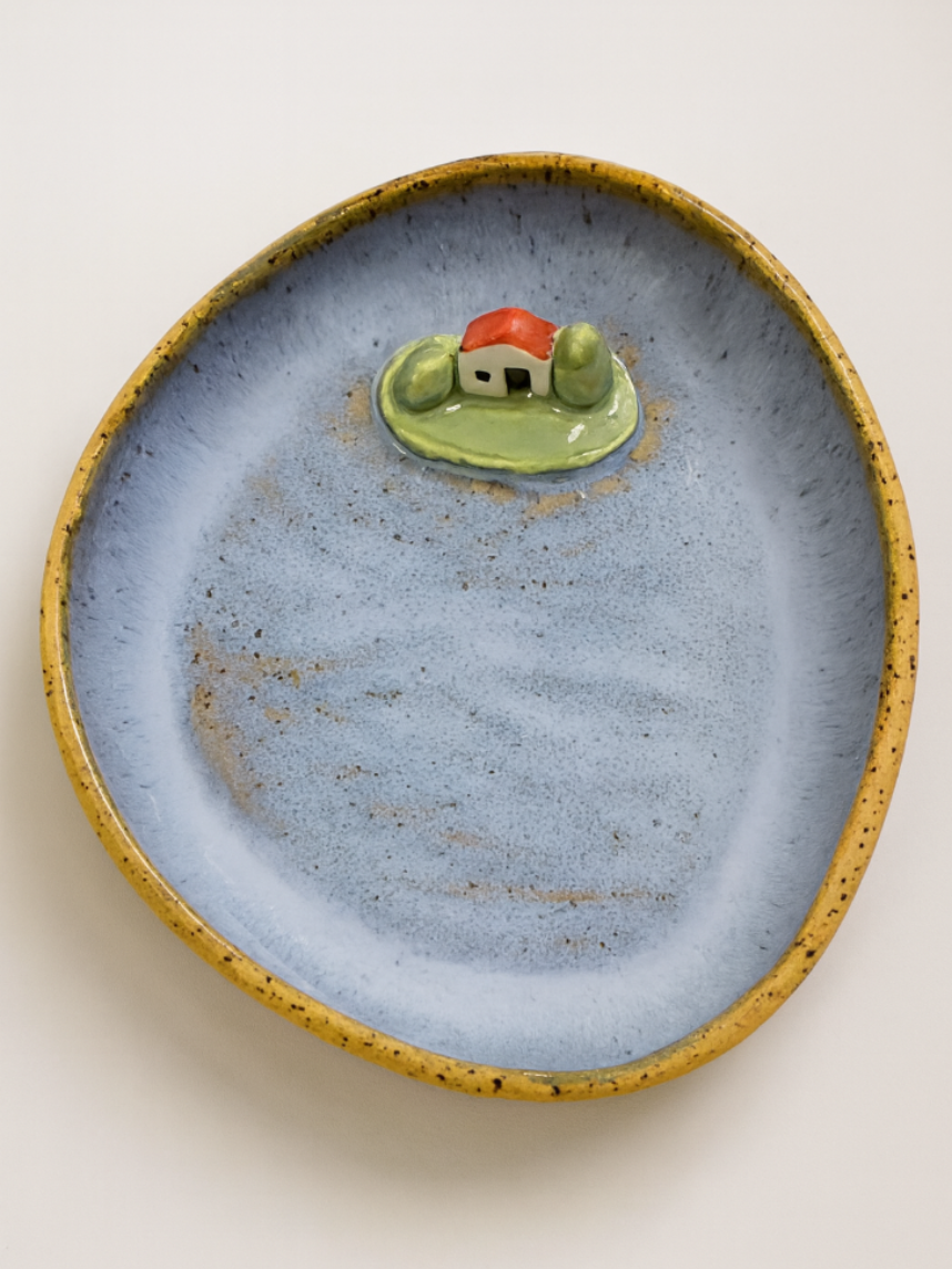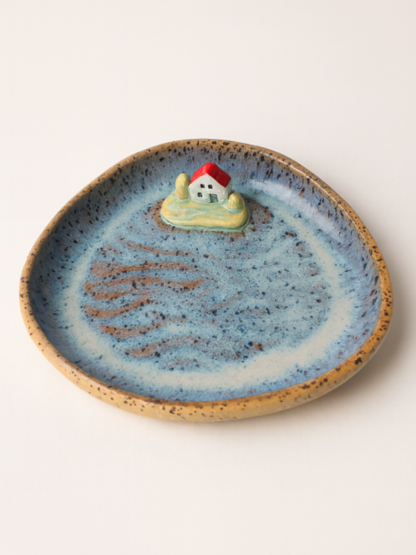 Фигурная тарелка в форме гальки с изображением моря и фигуркой домика внутри. Размеры тарелки: 14*12*3 см.