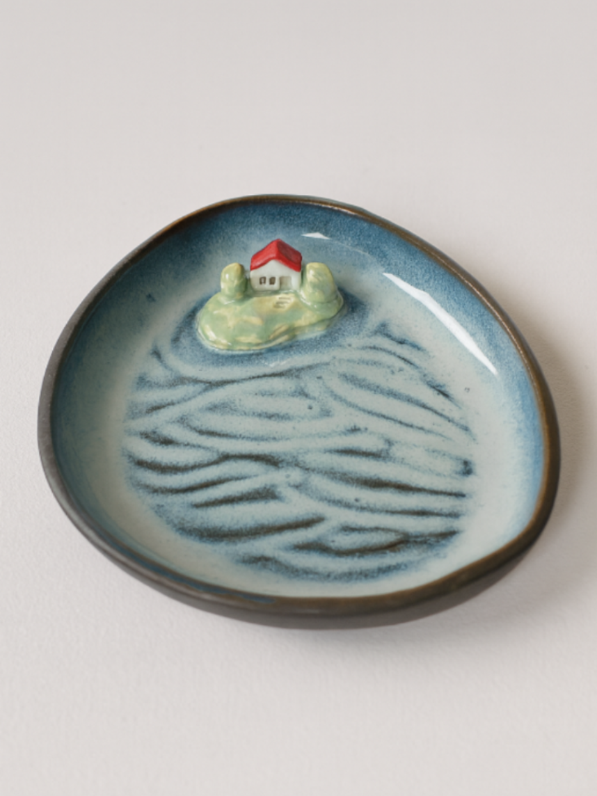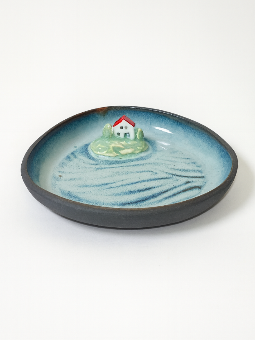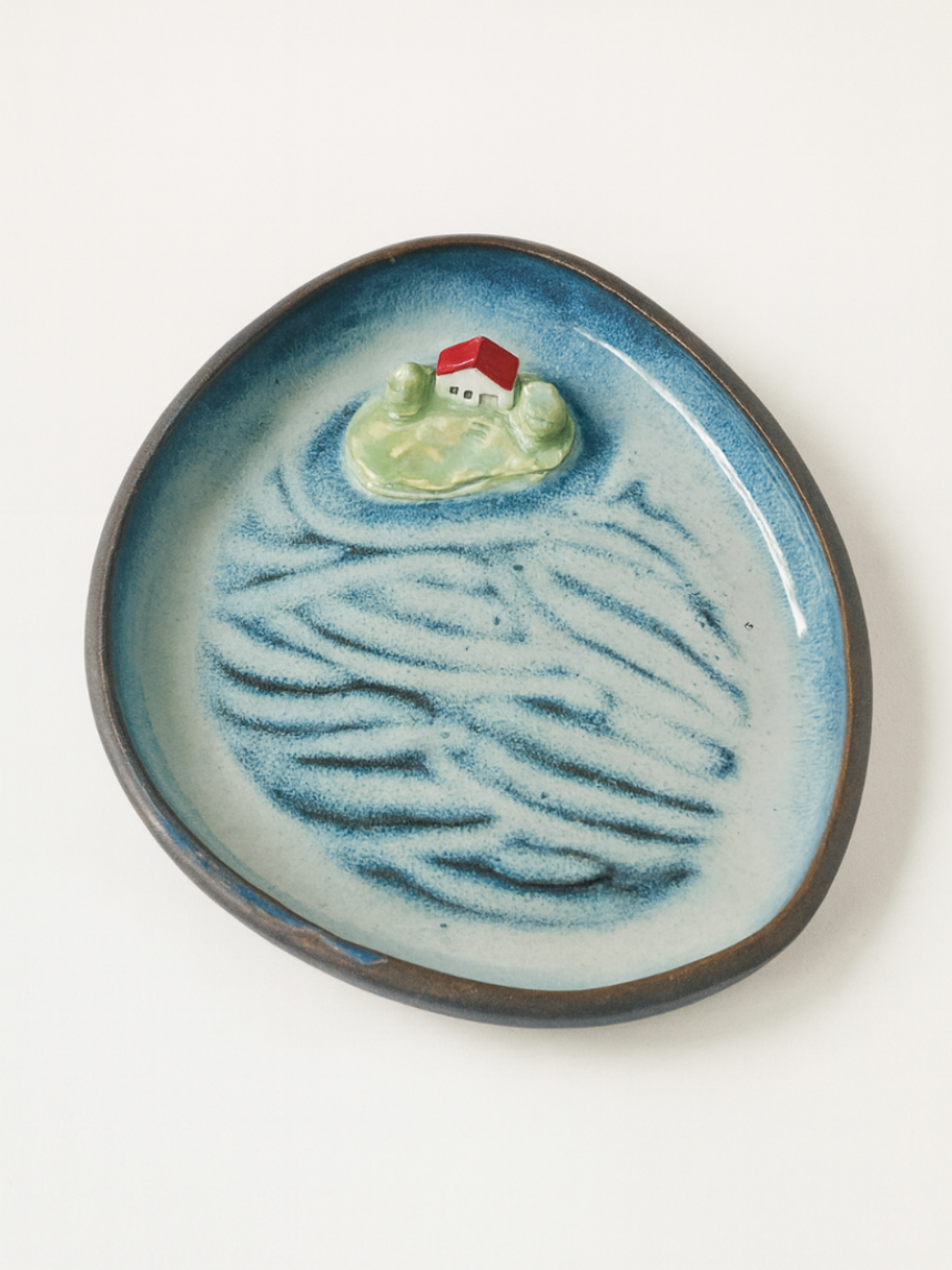 Фигурная тарелка в форме гальки с изображением моря и фигуркой домика внутри. Размеры тарелки: 14*12*3 см.