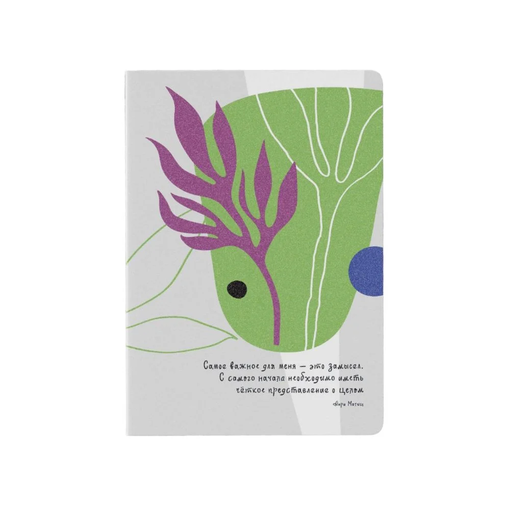 Тетрадь с цитатой художника Анри Матисса: "Самое важное для меня — это замысел. С самого начала необходимо иметь чёткое представление о целом." Обложка мягкая, но защищена матовой ламинацией от пятен и царапин. Бумага нелинованная, приятного кремового оттенка. На 1-ой странице есть место для подписи, а в самом конце - маленький сюрприз! Внутри - 36 листов без разлиновки, собранных на скрепку. Размер: А5, 145х210 мм.