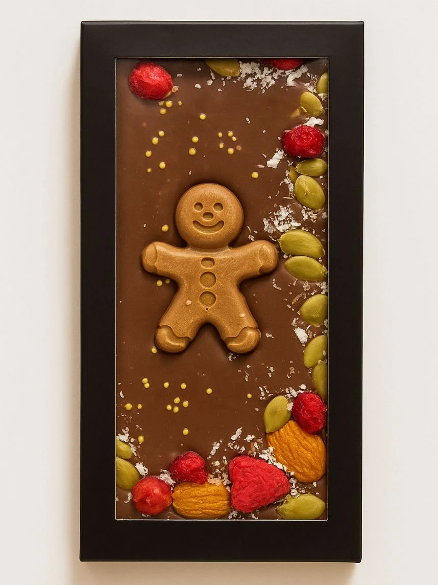 Почувствуйте дух Рождества и волшебства с этим ароматным тёмным шоколадом “Пряничный человек”! Насыщенный вкус тёмного шоколада прекрасно дополняется яркой кислинкой малины и брусники, а хрустящий миндаль добавляет пикантности и изысканности. Необычное сочетание ингредиентов и форма в виде забавного пряничного человечка создают атмосферу праздника и радости.