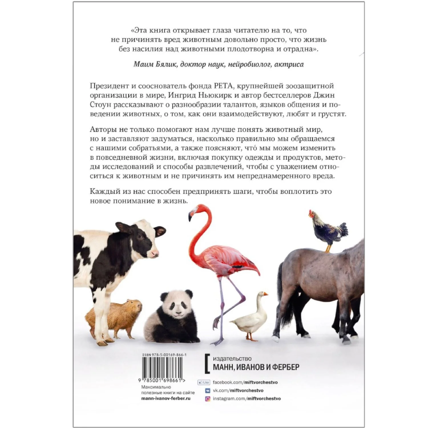 Президент и сооснователь зоозащитной организации PETA Ингрид Ньюкирк и автор бестселлеров Джин Стоун рассказывают о разнообразии талантов, языков общения и поведении животных, о том, как они взаимодействуют, играют, любят и грустят. Научные исследования показывают, что животные — это существа со сложным интеллектом, эмоциями, коммуникационными сетями и мириадами способностей. Ньюкирк и Стоун не только помогают нам лучше понять животный мир, но и заставляют задуматься, насколько правильно мы обращаемся с нашими собратьями, дают план, как относиться к ним с уважением и состраданием, и поясняют, что мы можем изменить в повседневной жизни, включая покупку одежды и продуктов, методы исследований и способы развлечений, чтобы остановить жестокость и не причинять животным непреднамеренного вреда. Будь то клинические исследования, тестирование продуктов, развлечения, одежда или еда, — теперь есть лучшие варианты, чем обижать животных. Мы можем заменить шерсть более теплым и легким флисом, отказаться от кожаных сумок и кожаной обуви, разработать новые методы исследований, которые больше не требуют содержания кроликов и обезьян в клетках, и не использовать животных для развлечений. Наши собратья заслуживают нашего уважения. Следите за шагами, которые каждый читатель может предпринять, чтобы воплотить это новое понимание в жизнь.
