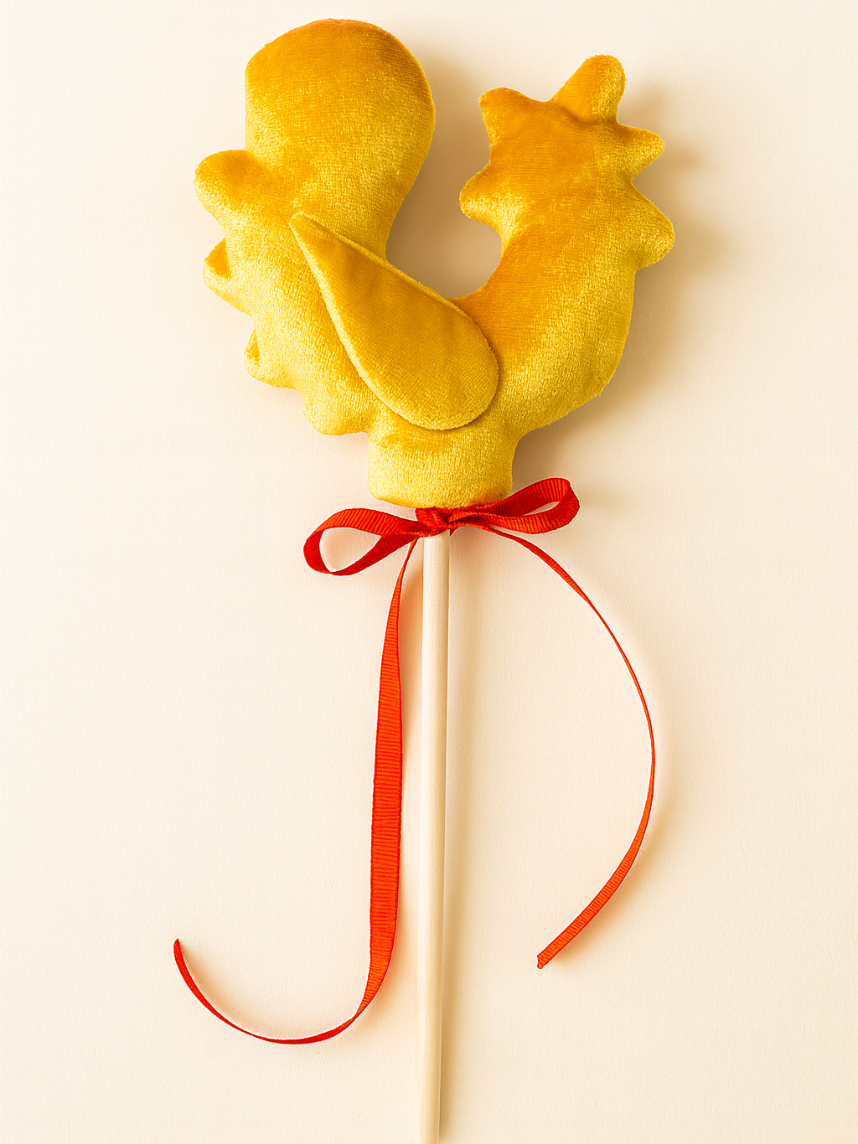 Внутри мягкого петушка спрятаны бубенцы, благодаря чему каждый взмах волшебной палочки сопровождается приятным звуком.