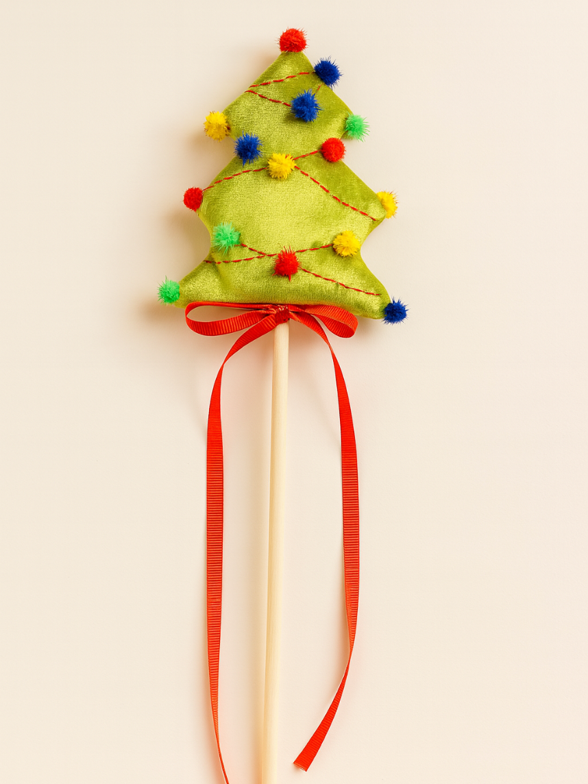 Сшита вручную, поэтому каждая палочка уникальна. Внутри мягкой ёлочки спрятаны бубенцы, благодаря чему каждый взмах волшебной палочки сопровождается приятным звуком.