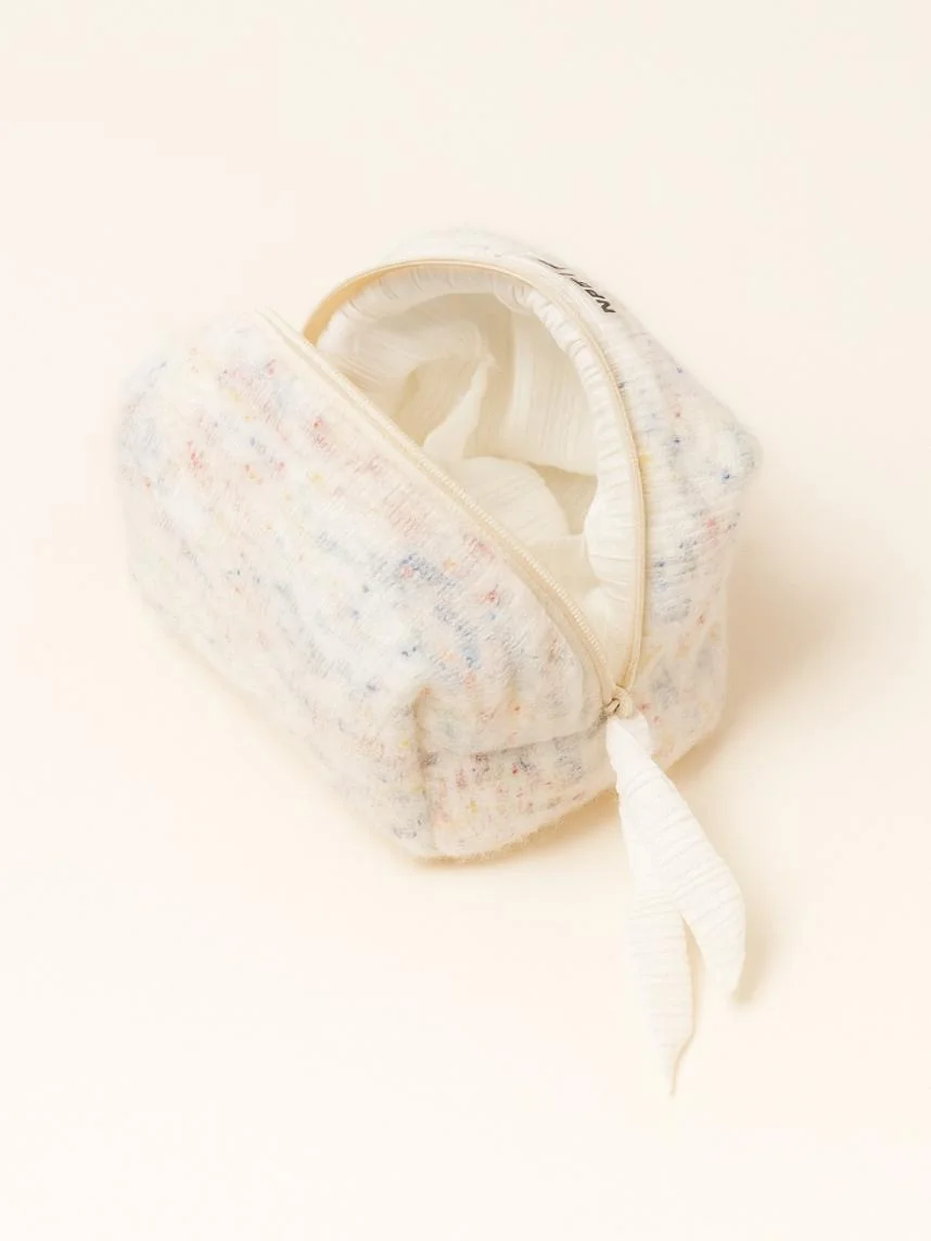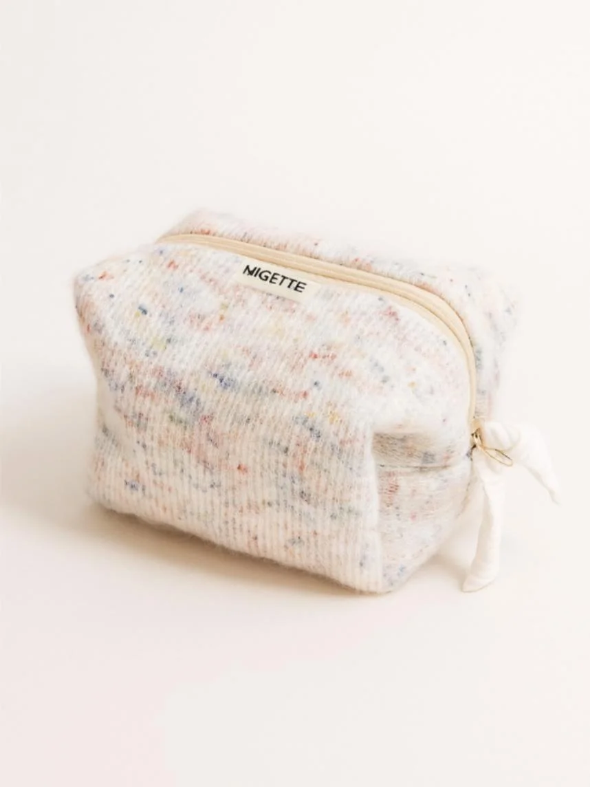 Вязаная косметичка ручной работы с карманом Мигетт, размер М, разноцветная с белым подкладом