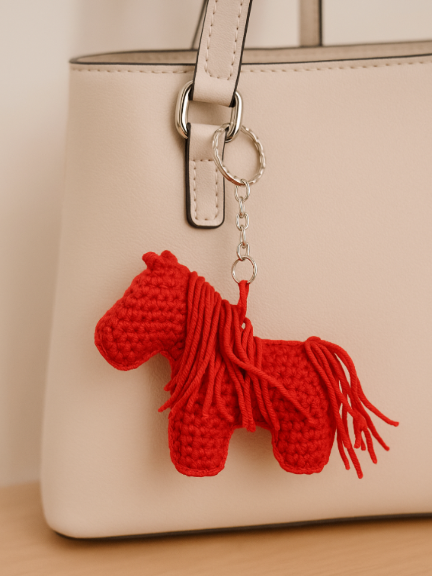 Вязаный брелок «Лошадка» — это милый и яркий аксессуар, выполненный вручную из мягкой пряжи.