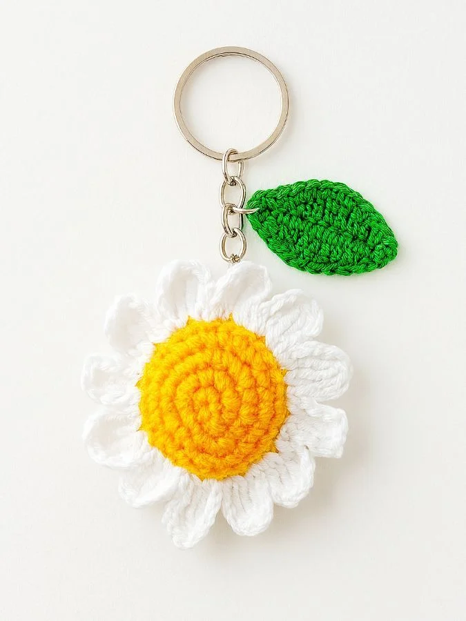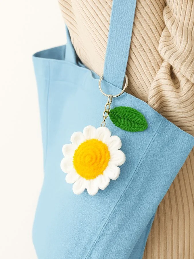 Яркий брелок ручной работы в виде ромашки будет радовать вас каждый день вне зависимости от времени года! Отлично смотрится на сумках и рюкзаках благодаря достаточно крупному размеру 6,5 см.