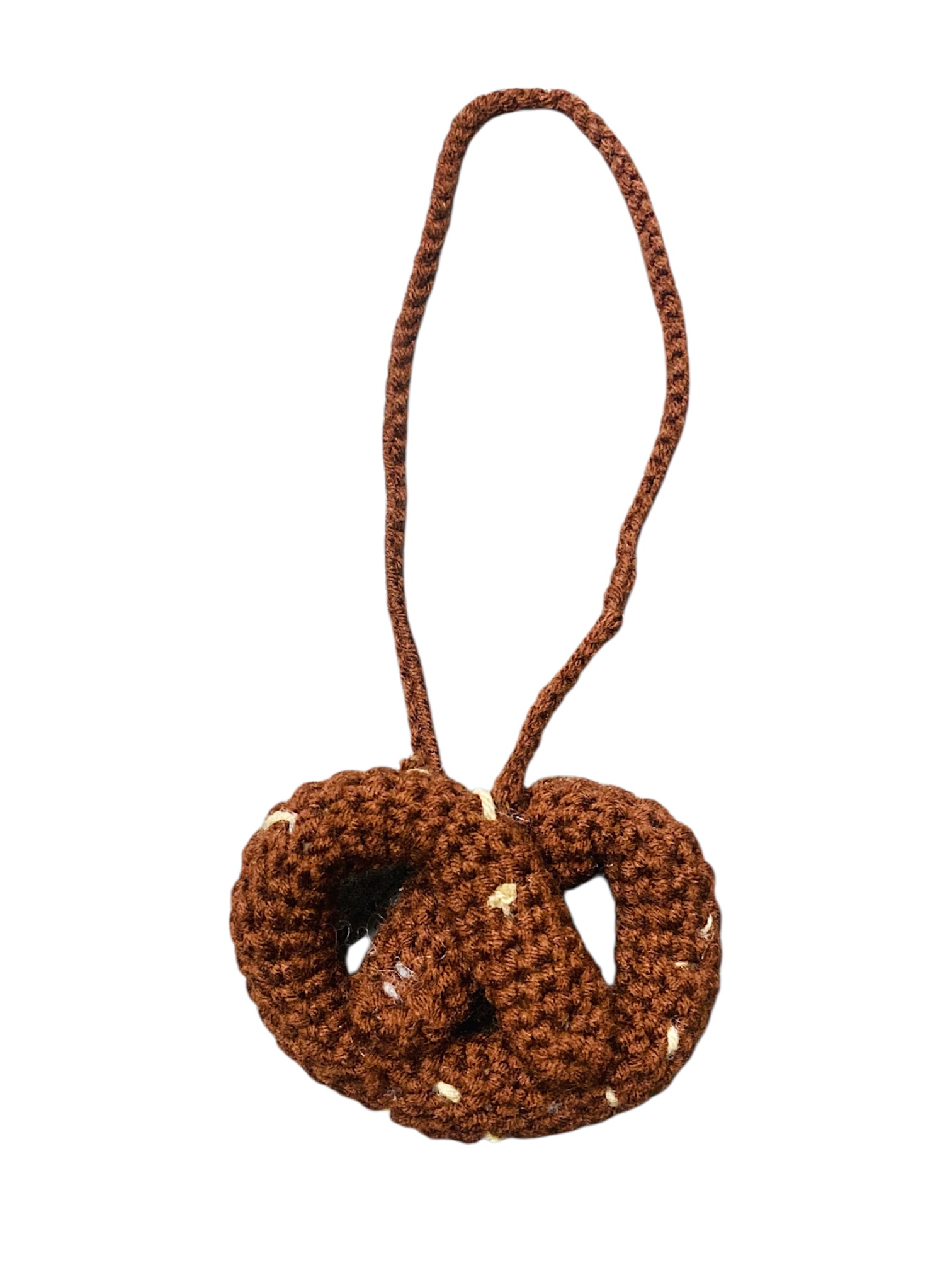 Вязаный брелок в виде кренделька от бренда svyazochka, размер 7 см, выполнен из шерстяной пряжи.