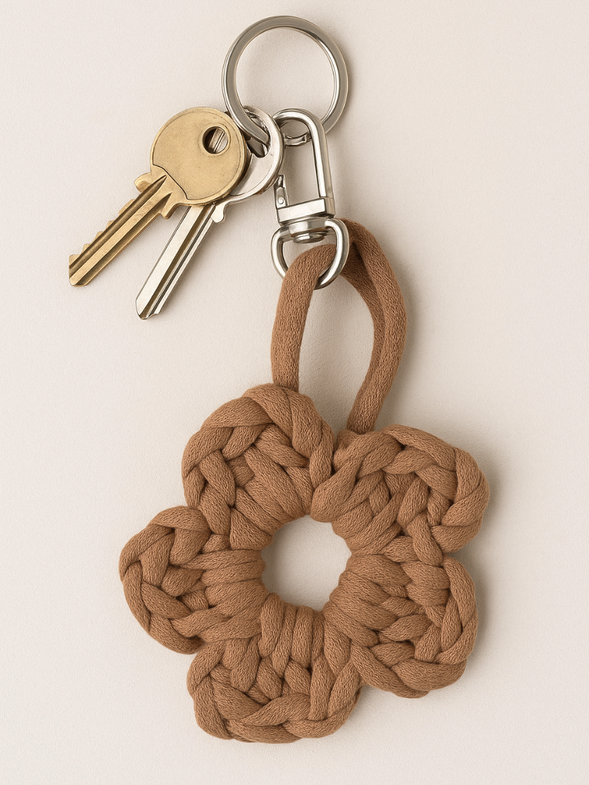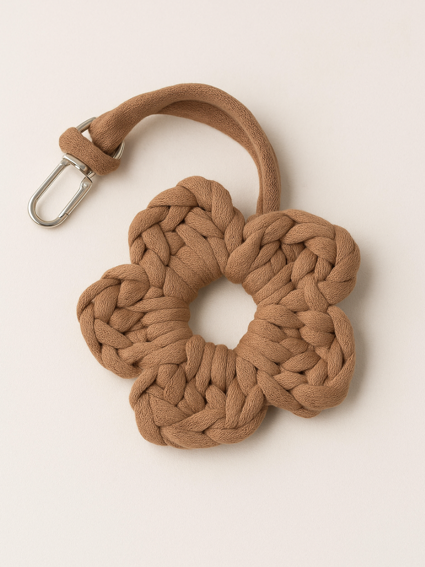 Вязаный брелок в виде цветочка от бренда novika выполнен из хлопкового шнура.