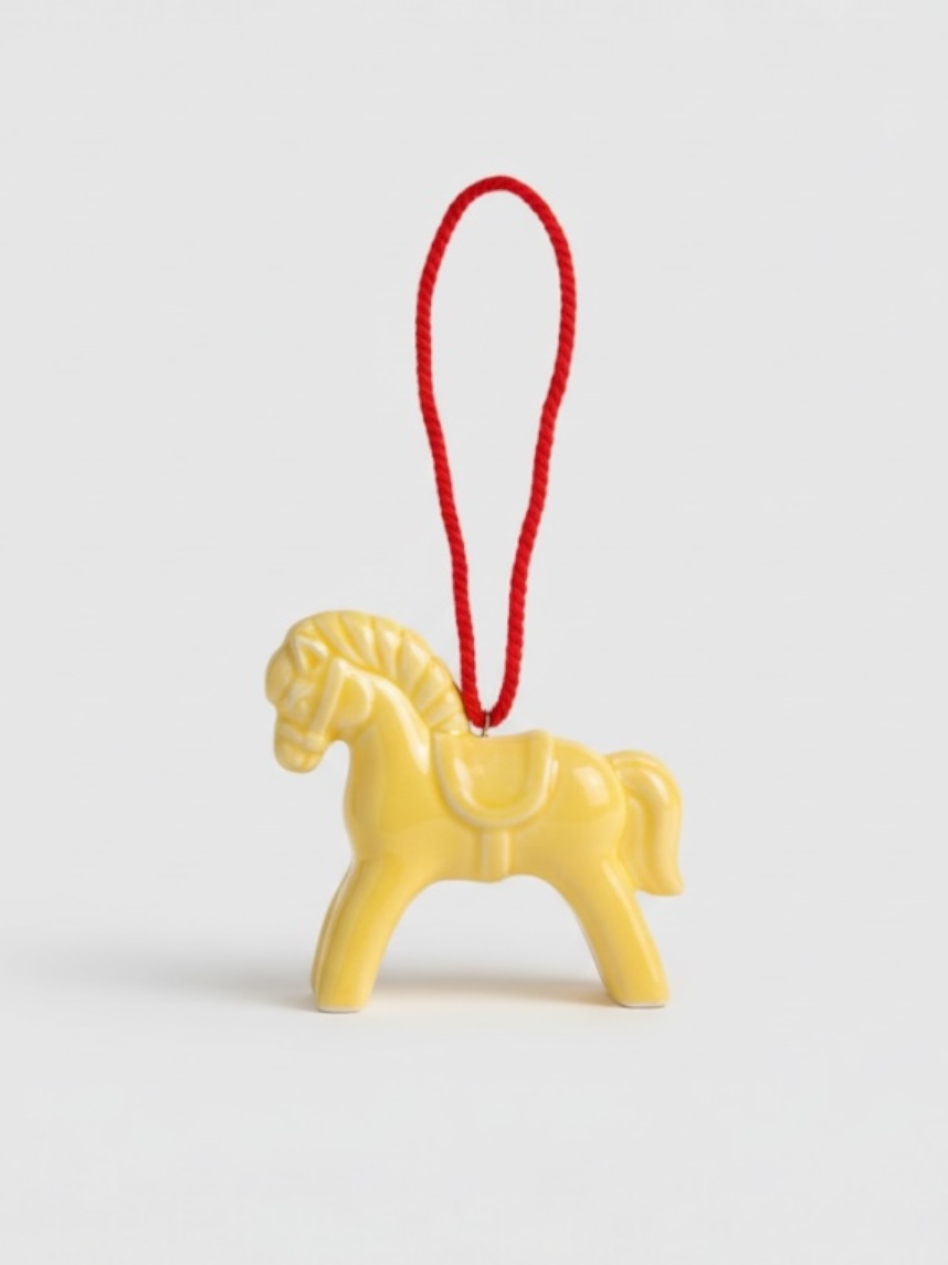 Ёлочная игрушка ручной работы «Лошадь», жёлтая, сделана из керамики.