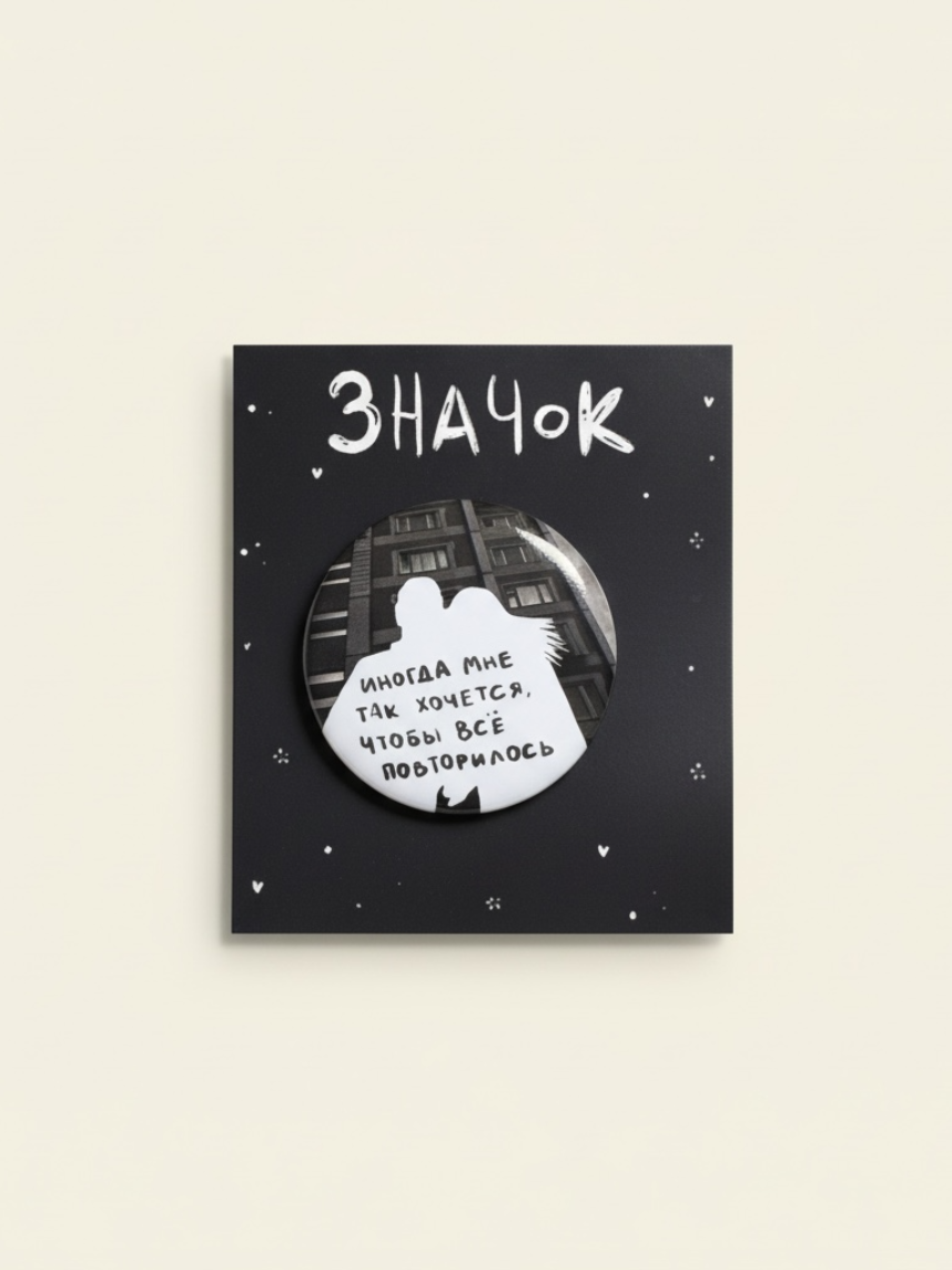Закатной значок с надписью «Всё повторилось» от бренда Лемниската