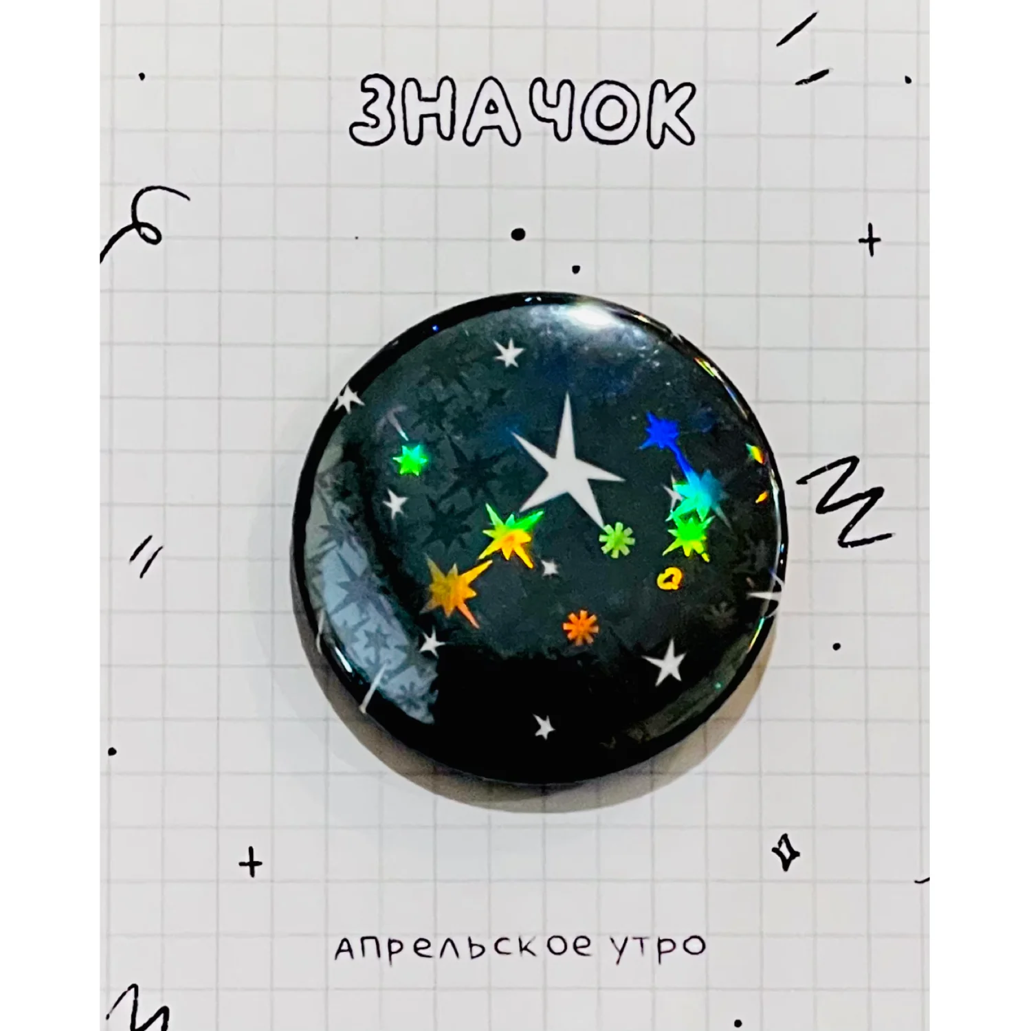Значок размером 37 мм бренда Апрельское утро с картинкой «Звёзды», переливающийся на солнце.